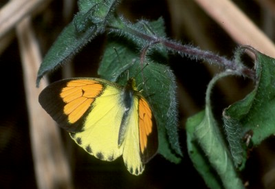 雄蝶上翅正面中央具大塊橙色斑,橙斑 外側為黑色,下側為淡黃色,雌蝶之黑 色區與雄蝶相似,其餘部分為白色。