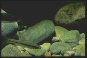 羅漢魚的雌魚有一條縱帶,沒有鬚,側線完全 ,身體的顏色和雄魚一樣,背部銀灰色,腹面銀白 色,雜食性,通常產卵在垂直的石壁或木頭上,卵 為附著性。