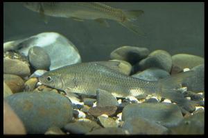 鯁魚有2對很短而不容易察覺的鬚,有時候甚 至退化。身體背部青灰色,腹部銀白色,胸鰭上方 有10多片鱗片的基部具有藍黑色斑點,幼魚的尾 鰭基部有一個黑色斑點。喜歡吃藻類、植物碎屑和 浮游生物,最大可以長到10公斤左右。本種也是 從大陸引進的養殖魚類,通常2年可以長到23公 分左右。