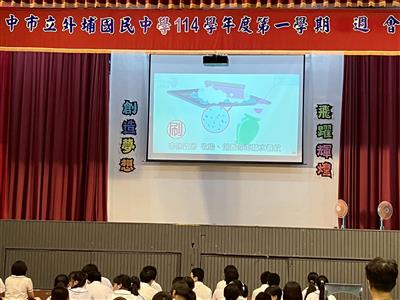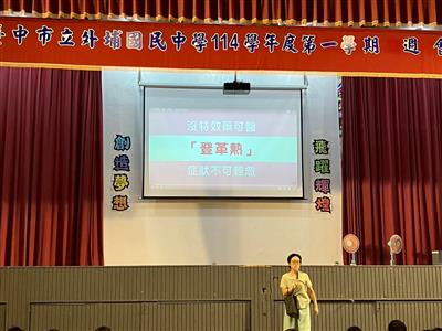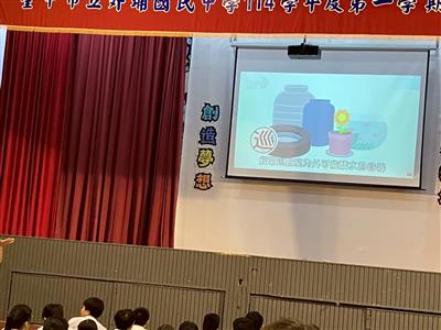 利用影片播放讓師生了解登革熱與防治方法,並透過環境衛生教育,提醒學生落實「巡、倒、清、刷」四步驟,杜絕病媒蚊孳生,在看到可疑得積水容器或積水處要落實四步聚,並養成居家環境整潔的習慣。