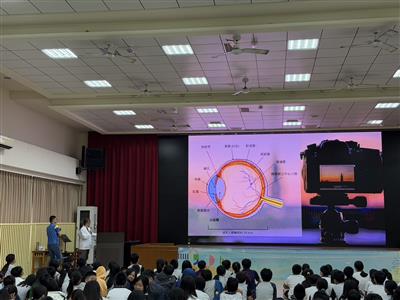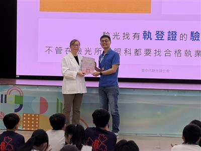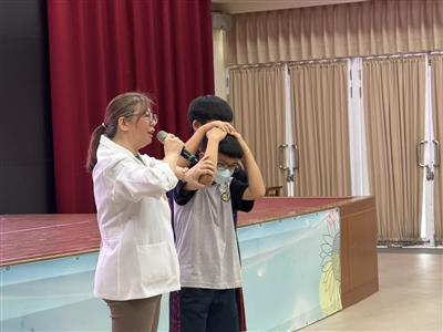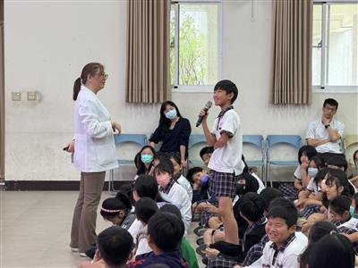 驗光師經由和學生對話的方式,讓孩子們了解近視成因及近視的困擾與影響,學生們回答踴躍,但秩序稍嫌不佳,講座結束之後,主任加以勉勵,期待獲得更大成效。